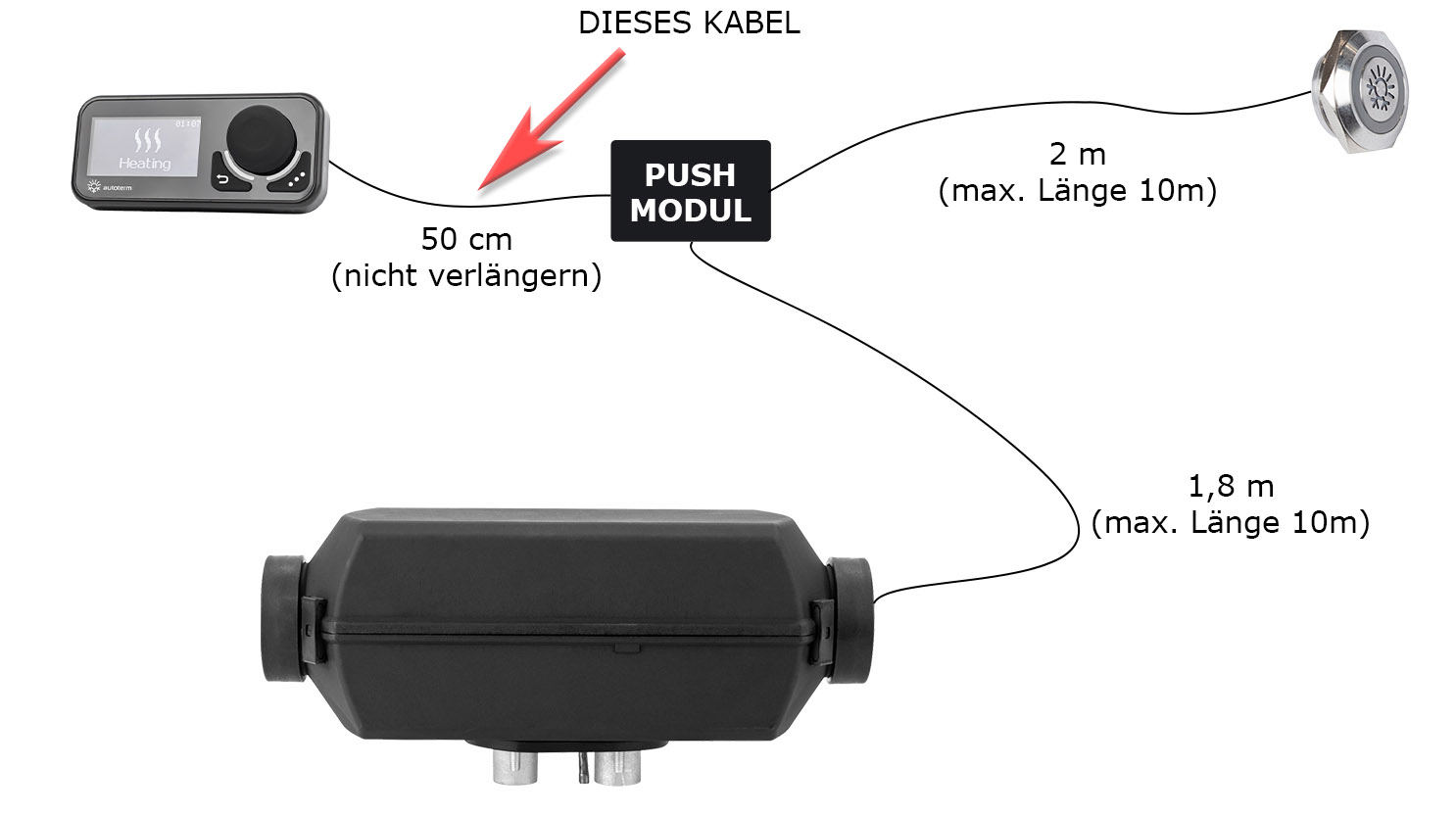 Push Module Verbindungskabel wird verwendet, um Push-Bedienteile in das AUTOTERM Steuerungssystem zu integrieren. Ideal für den Einsatz in Wohnmobilen, Vans, Expeditionsfahrzeugen, Booten und Nutzfahrzeugen mit AUTOTERM Standheizung.
